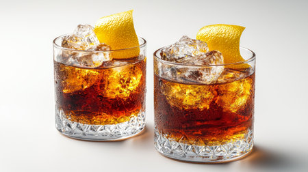 Glasses of cool refreshment coke with organic lemon slices and ice cubes served on a gold tray.