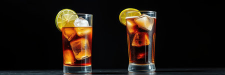 A glass of cola lime drink on a black background