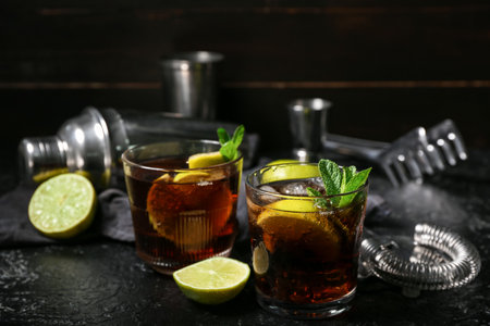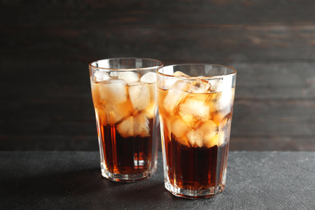 Glasses of tasty Cuba Libre cocktail on dark background
