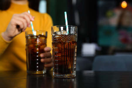 Glass of refreshing cola and blurred woman on background. Space for text