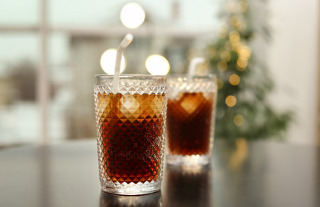 Glasses of cold cola against blurred fairy lights. Space for text