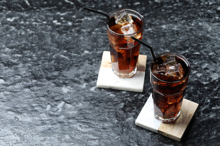 Refreshing cola with ice cubes and straws in glasses on dark textured table. Space for text