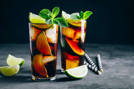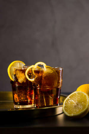 Cuba libre on dark background. Traditional summer alcohol iced drink.