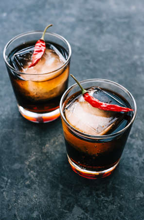 Whiskey and cola in glass decorated whit dried chili peppers on dark background.