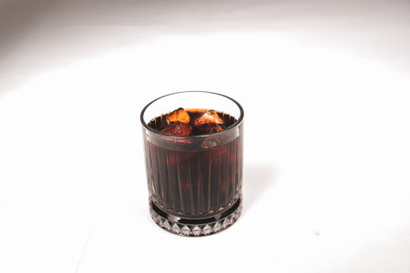 A glass of cola with ice cubes on a white background.
