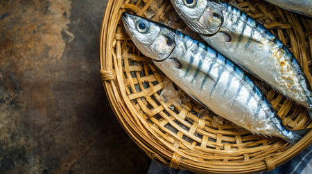 Close-up of mackerel in a traditional bamboo basket, leaving space for text or branding. Perfect for food-related advertisements or market displays.