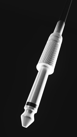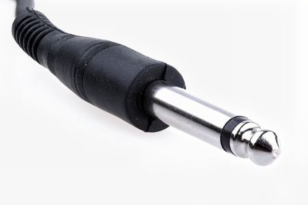 Quarter inch retro styled guitar cable connector with coiled cable in background