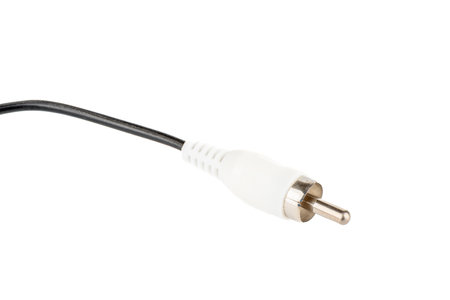 RCA to stereo jack audio cable adapter cable red and white RCA plugs and black 3.5mm connector, macro closeup of analog AV wiring accessory on white background, music, sound and HIFI equipment, nobody