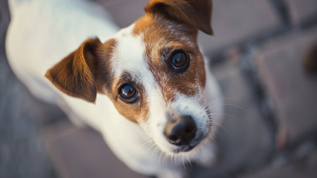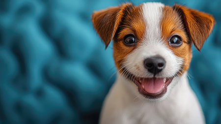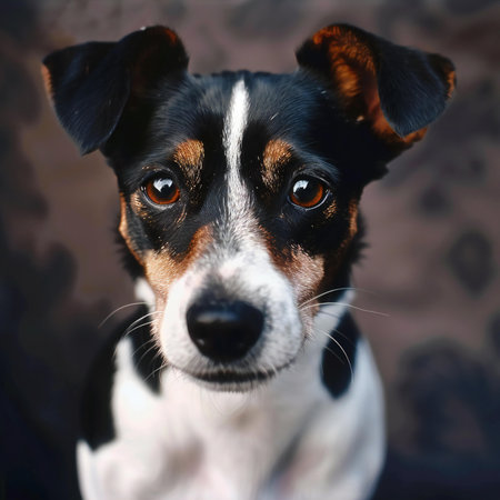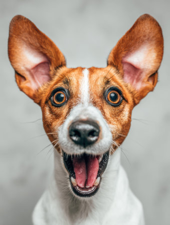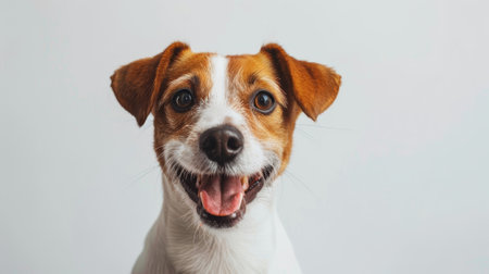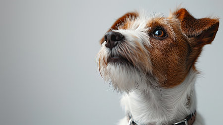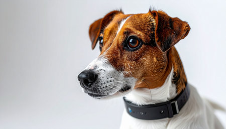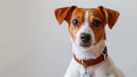 A close-up studio portrait of an intelligent and alert Jack Russell Terrier. With a focused gaze and curious expression, this loyal companion waits patiently, showcasing the breeds characteristic charm and devotion. The clean, simple background emphasizes the dogs expressive features and friendly nature.