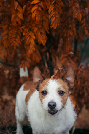 Portrait of a cute dog breed Jack Russell Terrier running in the autumn forest