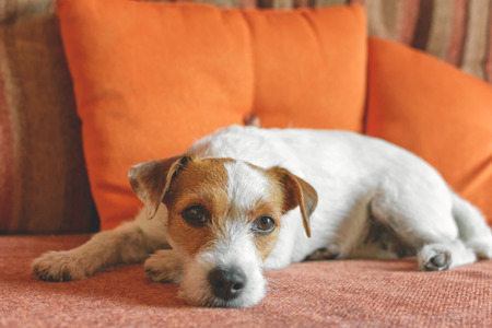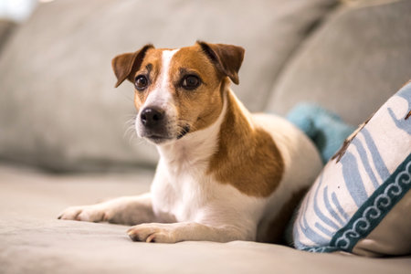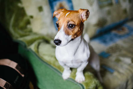 Jack Russell Terrier dog sitting on a sofa in the living room