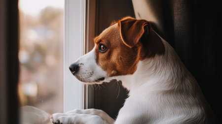 Side view of a dog sitting by a window, gazing outside, waiting for its owner to return.