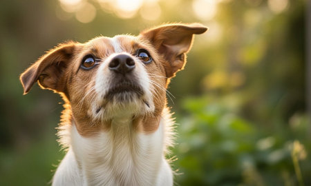 Close-Up Portrait of a Small Dog Looking Upwards in Golden Light