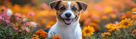Cute dog smiling in a vibrant flower garden, joyful atmosphere, springtime vibes