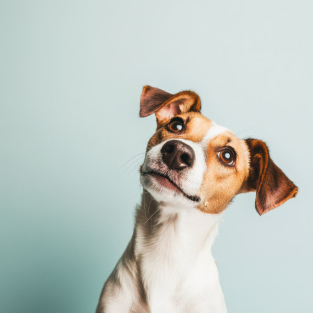 A curious dog tilts its head showcasing its playful expression against a soft light blue background capturing attention with its charm.