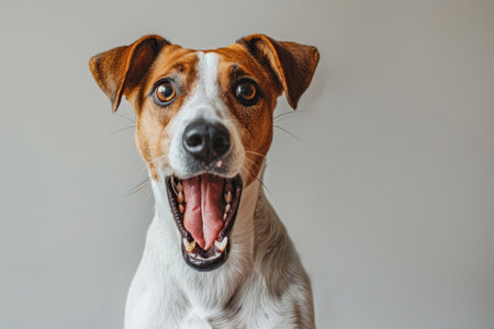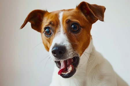 Close up of Funny Dog with wide eyes and open mouth expressing surprise or curiosity. A white background highlights the dogs bright coat and expressive face