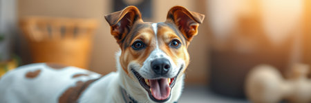 A cheerful, small to medium-sized dog with brown and white patches poses indoors