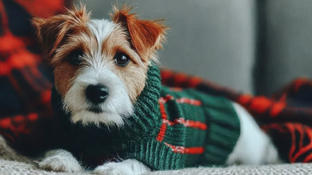 A charming Jack Russell Terrier dog is relaxing on a couch, dressed in a warm, knitted green sweater with red accents, looking directly at the camera.