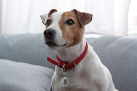 Dog jack russell terrier close-up. A cute pet dog looks away.