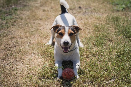 A Jack Russell Terrier dog playing with a ball in the park.