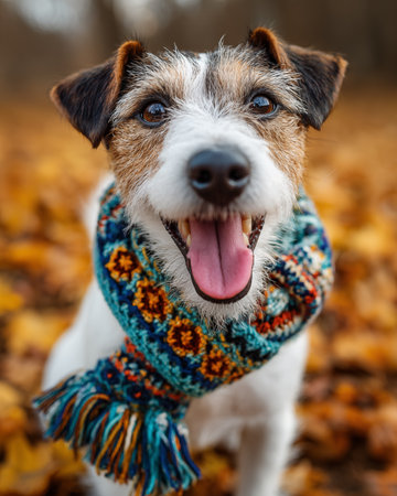 Jack Russell Terrier in a scarf on the background of autumn leaves