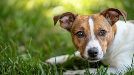 Jack russell terrier dog lying in the grass looking at the camera