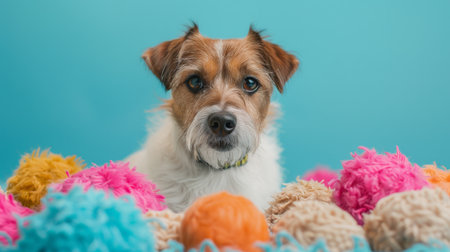 Cute dog with different pet accessories on blue color background. Pets and animals care concept. Generative ai.