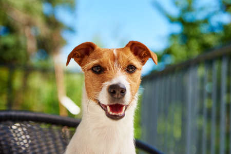 Cute dog portrait outdoors, Jack Russell terrier sitting at balcony on summer day, Funny pet looking at camera