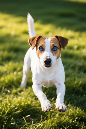 Jack russell terrier dog with blue eyes running on green grass