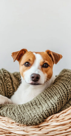 Dog wrapped in cozy knit blanket in basket, vertical orientation, AI generated
