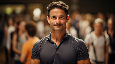 Portrait of a happy man in a gray shirt looking at the camera and smiling