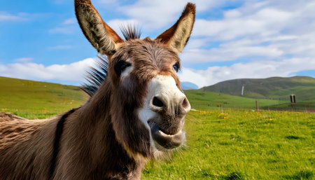 This delightful image captures a happy donkey grinning broadly in a sunny countryside setting. The playful expression and warm sunlight create a joyful atmosphere.