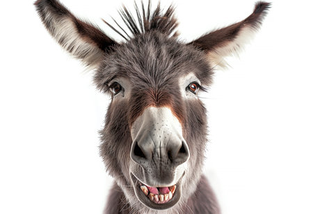 Donkey with a slight head tilt, adorable and friendly, bright white background, crisp shadows, high-resolution, charming personality