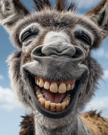 A joyful donkey grins widely, showcasing its bright personality against a serene farm background. This cheerful scene captures the essence of rural life.