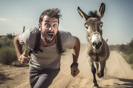 Scared man selfie with running donkey. Online self vlog. fictional person. Generate AI
