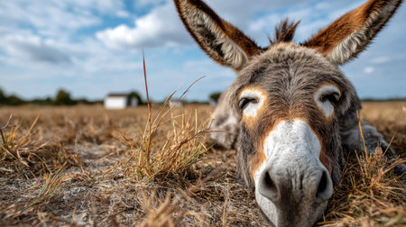 A close-up view of a relaxed donkey resting on dry ground, surrounded by golden grass under a bright blue sky with fluffy clouds, showcasing rural serenity.