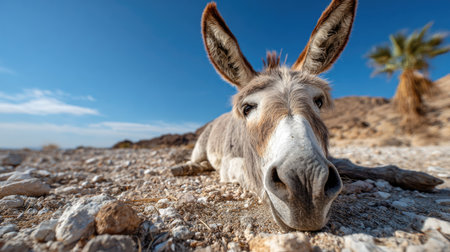 This close-up image captures the charming face of a donkey resting on rocky ground, set against a vibrant blue sky with soft clouds, embodying rural tranquility.
