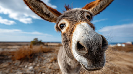 Close up of donkey's face with blue sky in the background. Generative AI.