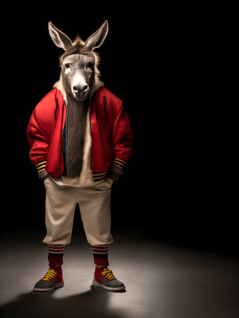 Creative animal concept. Donkey full body in hip hop stylish fashion isolated on dark background, commercial, editorial advertisement, surreal, copy text space