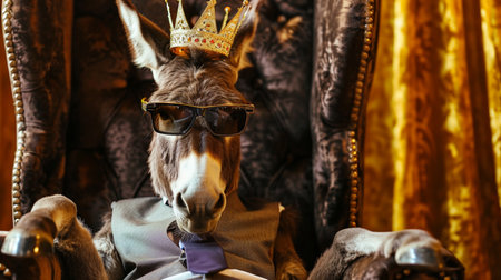 donkey wearing tie with crown and sunglasses sitting on a throne, closeup