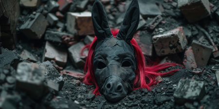 A portrait of a cute donkey hiding the face behind a pile of twigs