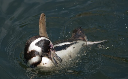 a humboldt penguin bathing and cleaning its fur