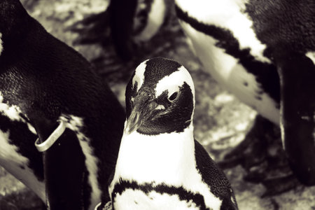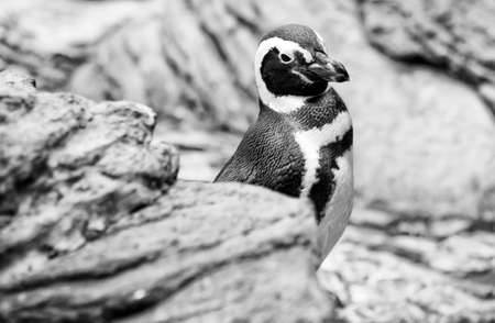 African penguin standing on a rock in black and white, South Africa.