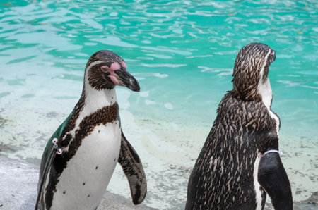 Close up of penguin in the zoo ,blue water background
