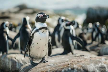 Group of black and white penguins having fun at the ocean Boulders beach. South africa