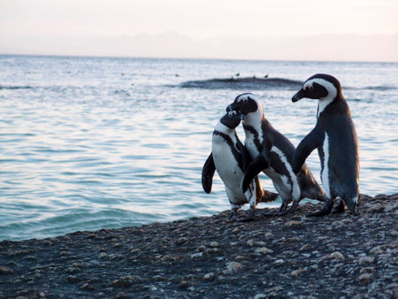 African penguin on the coast at sunset twilight. African penguin ( Spheniscus demersus) also known as the jackass penguin and black-footed penguin. Boulders colony. Cape Town. South Africa