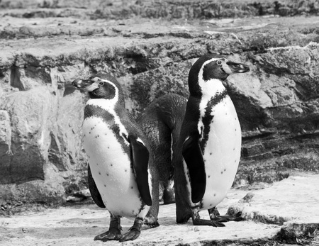 Humboldt penguins standing in natural environment, on the rocks near the water