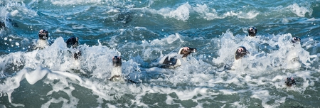 African penguin walk out of the ocean in the foam of the surf. African penguin ( Spheniscus demersus) also known as the jackass penguin and black-footed penguin. Boulders colony. South Africa