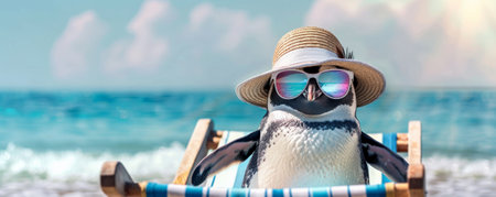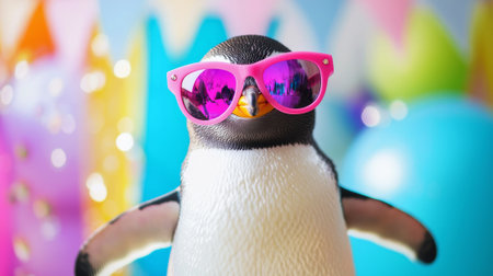 Cute penguin wearing pink sunglasses in vibrant setting. concept of fun, color, playfulness, and personality, funny pet, cute animal bird Summer.
