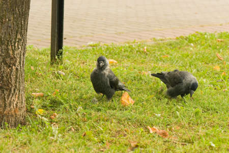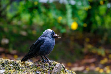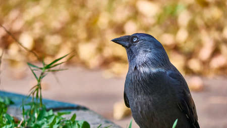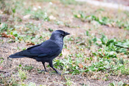 A jackdaw bird walks and searching a food. The jackdaw is walking on the ground at the autumn